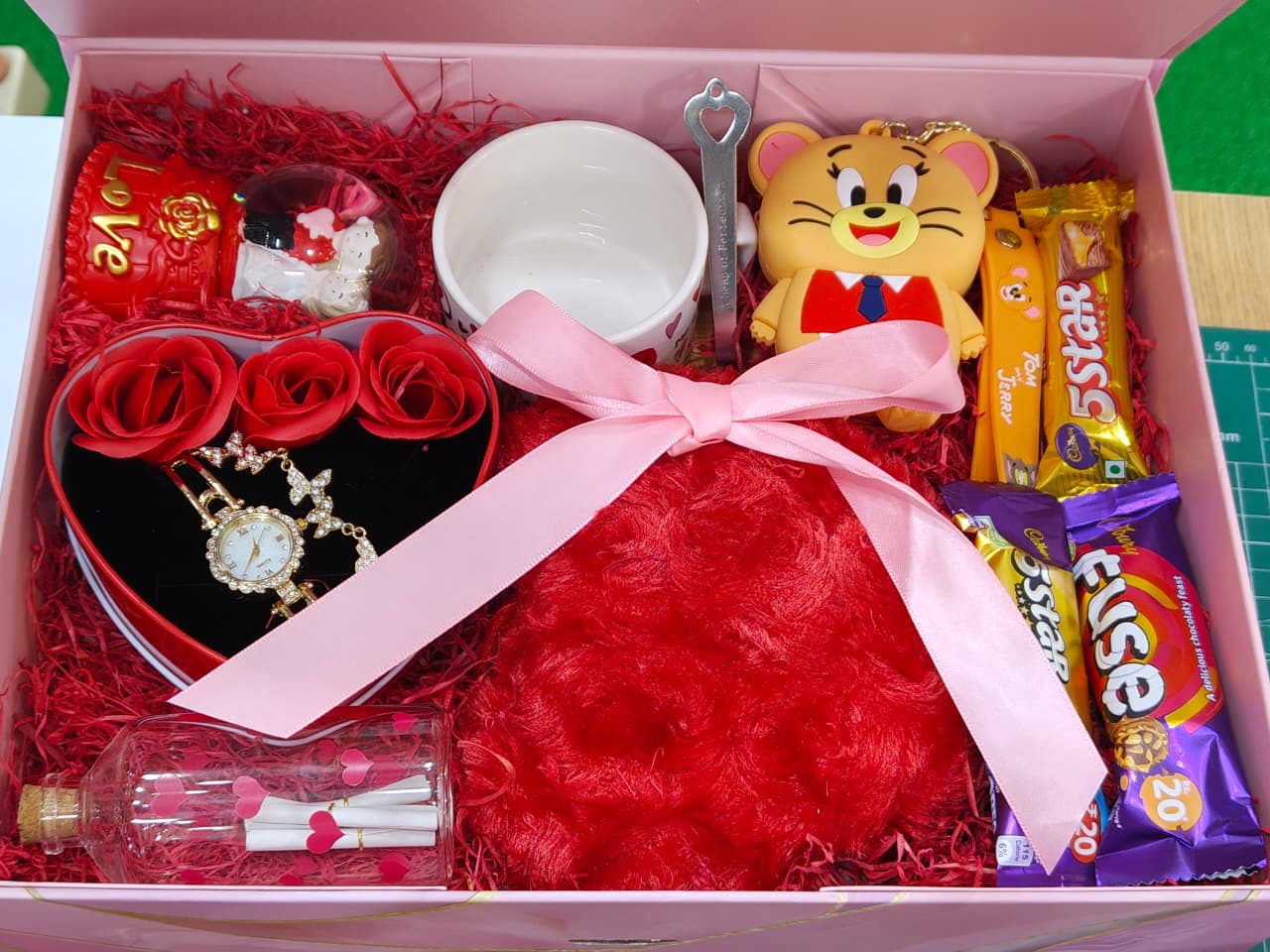 Big size pink hamper box for your loved one. Includes couple doom, love coffee mug, wrist watch and bracelet heart box, soft heart with teddy inside, Jerry key chain, a msg bottle with some chocolates.