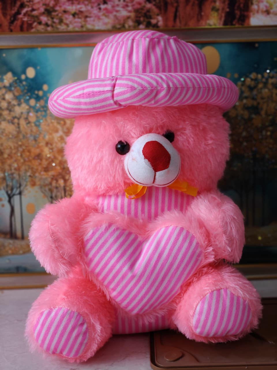 Cap teddy with heart in his hand.