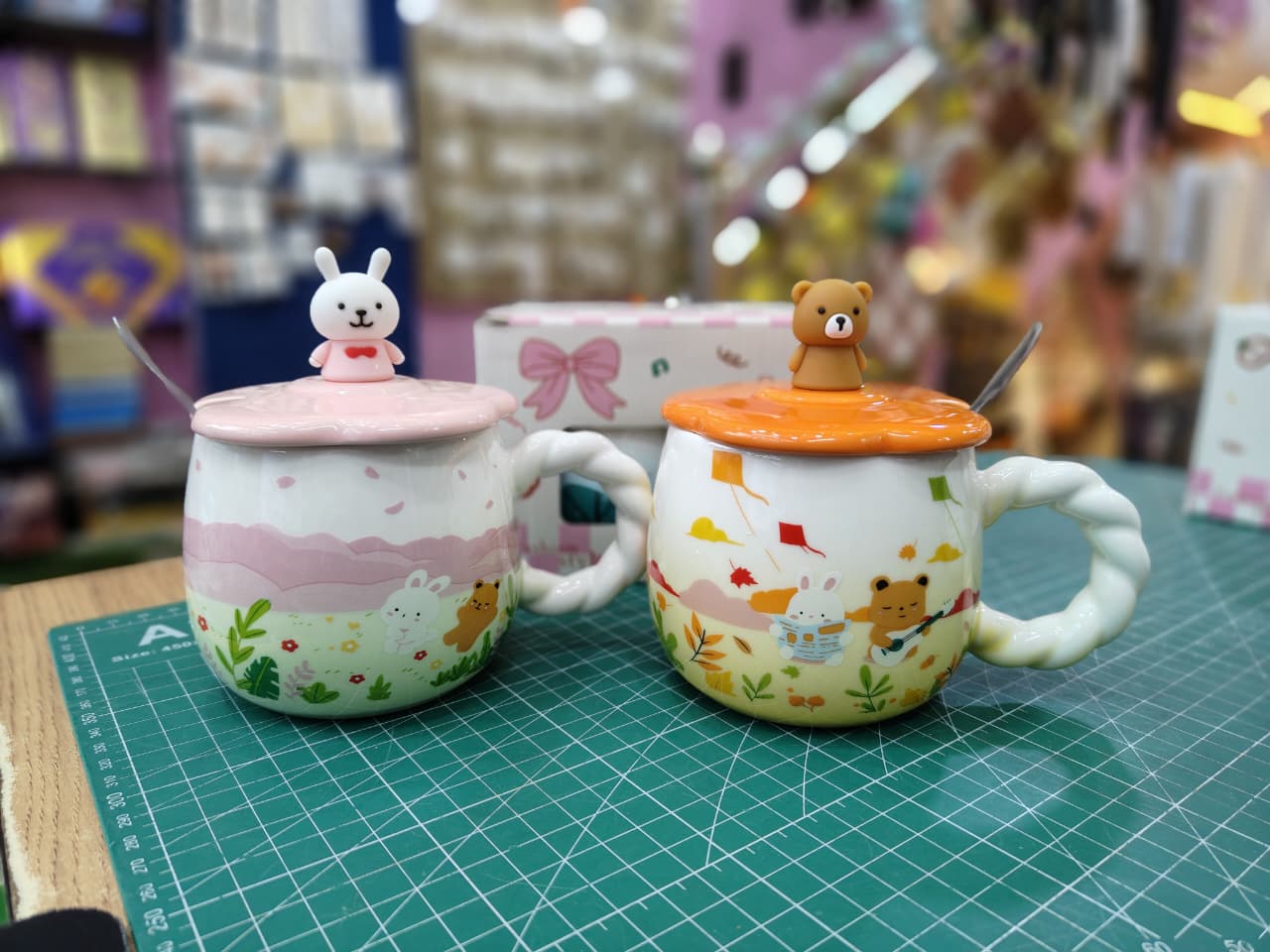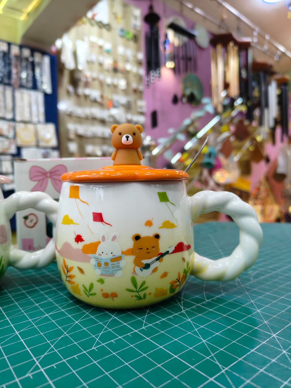 Cute ceramic mug with lid on top with cute figures includes spoon